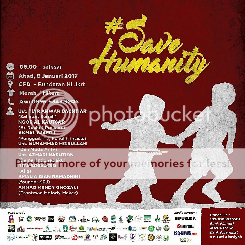 Warga Aleppo dibantai, orang-orang Rohingya dihabisi, dan nyaris seisi dunia bungkam. Saatnya kita teriakkan pembelaan dengan pekik yang membahana dari negeri kita, Indonesia! Inilah saatnya kita membuktikan kepada para pahlawan negeri kita bahwa kita adalah pewaris mereka dalam memperjuangkan kemerdekaan yang merupakan hak segala bangsa. Kepalkan tanganmu bersama para pembela kebenaran!